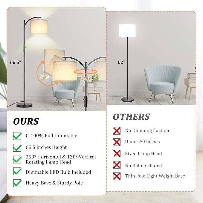 - Flexible Lampshade with 350° Horizontal Rotation & 120°Vertical Rotation: 68.5” arc floor lamp comes with a rotating head that can be rotated horizontally or vertically, assuring convenience for daily life. When you put the floor light behind your couch, you can adjust the lamp shade to any angle you like, which is very proper for reading and working